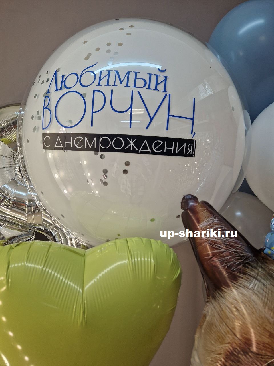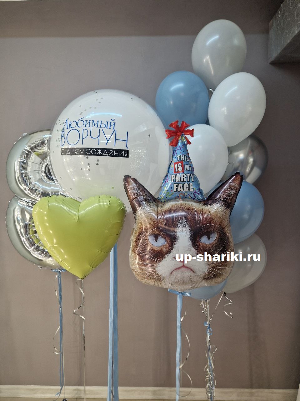 Набор 122 Шар даблстаф 60 см (с индивидуальной надписью и декором конфетти) — 1 шт Цифра фольгированная — 1 шт Фигура фольгированная «Кот в колпачке» — 1 шт Фигура фольгированная «Сердце» — 1 шт Шар пастель — 10 шт Шар хром — 4 шт Грузик — 5 шт