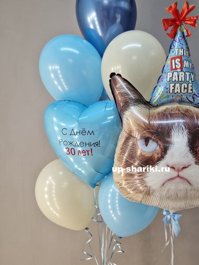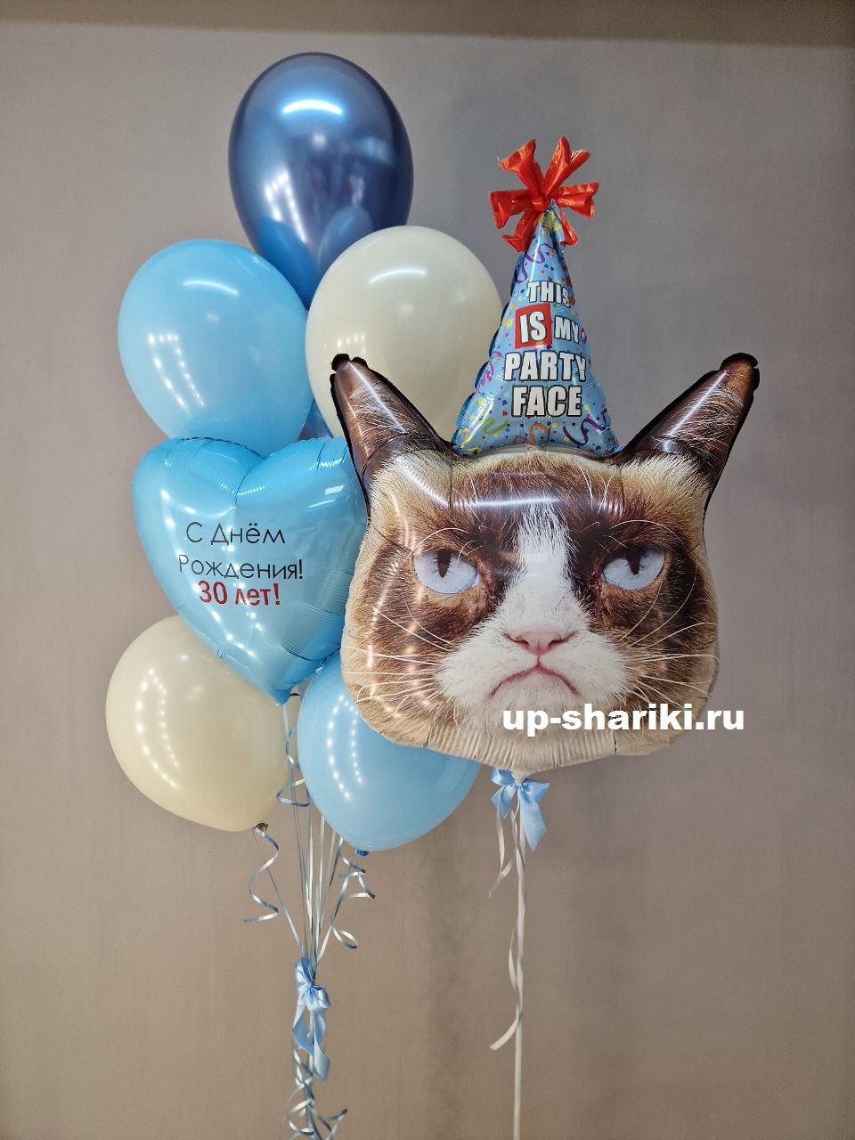 Набор 131 Фигура фольгированная «Кот в колпачке» — 1 шт Фигура фольгированная «Сердце» (с индивидуальной надписью) — 1 шт Шар хром — 2 шт Шар пастель — 7 шт Грузик — 2 шт